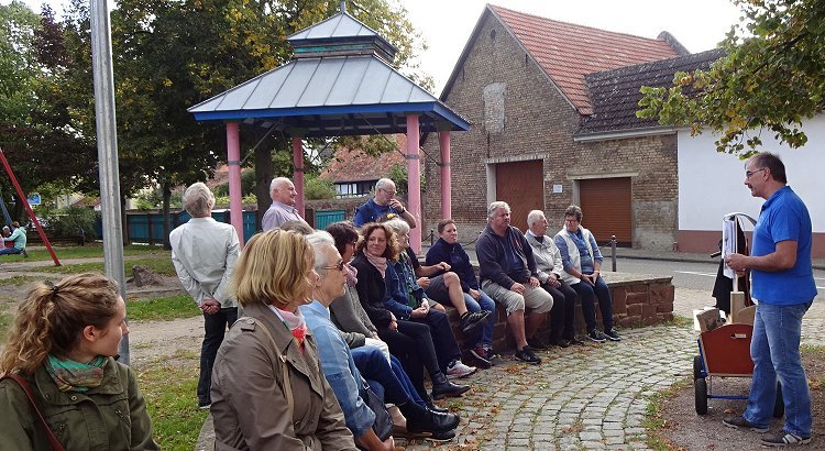 Lothar Walbrecht informiert die Vormittagsgruppe über die Geschichte des "Friedrich-Ebert-Platzes"