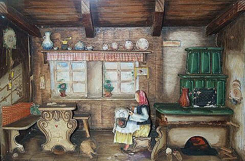 | Man nimmt am besten dieses und das vorige Bild zusammen: sie stellen beide die erzgebirgische "Stub" dar, dieses Bild eine bessere, das vorige Bild eine "einfache" - das sieht man beim Vergleich der beiden Einrichtungen: bei den Möbeln (Tisch und Bank) ist der Versuch zu spüren, das rustikale Element durch Verzierungen zu überspielen; ähnlich ist der Unterschied der beiden Öfen. |