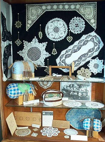 Die ganze Vitrine ist dem Erwerbszweig gewidmet, der in der Mitte des 16. Jahrhunderts in Annaberg aufblühte und den man mit dem Namen Barbara Uttmann in Beziehung setzt. Sie stand an der Spitze von etwa einem Dutzend Verlegerinnen, und beschäftigte allein 900 Klöppelmädchen. die für sie arbeiteten. Ob sie diese Kunst, die sich rasch zu einer Volkskunst entwickelte, aus Brabant ins Erzgebirge gebracht hat oder da nur für ihre Verbreitung gewirkt hat, ist nicht eindeutig auszumachen. Sicher aber ist, daß sie damit erfolgreich gegen die Armut geholfen hat. Es gab bald eigene Klöppelschulen (das Foto im mittleren Teil) und so verbreitete sich diese Kunstfertigkeit bald über das ganze Erzgebirge. Die Vitrine zeigt im oberen Teil Stücke, die in Nauheim geklöppelt wurden, wo im "Erzgebirgischen Heimatverein" diese Kunst weiter gepflegt wird; im unteren Teil die Mustervorlagen, die auf den "Klippelsack" gelegt wurden und durch Nadeln den Verlauf der Arbeit bestimmen.