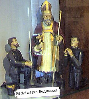 Ein Einzelteil aus den sakralen Holzschnitzarbeiten offenbart einen Zug des erzgebirgischen Bergmanns: die fromme und vertrauensvoll auf den Bischof blickende Haltung der knieenden Bergleute zeigt diesen religiösen Grundzug der Bergleute, der sich auch in der großartigen Gestaltung der Kirchen dieses Raumes, z.B. in Annaberg oder Schneeberg, niederschlägt. Das Gleiche zeigt sich auch in der feierlichen Begehung kirchlicher Feste, wie etwa in der "Mettenschicht" zu Weihnachten. Das änderte sich auch nicht, als der größte Teil der Bewohner des sächsischen Erzgebirges sich der Lehre Martin Luthers anschloß. |