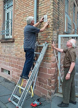 Otto Blohberger bringen eine neue Hausnummer am Museum an